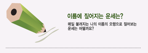 3. ¸¶Âù°¡Áö·Î ÀÚ½ÅÀÇ À̸§ÀÇ °¡¿îµ¥ ÀÚ¿Í ³¡ ÀÚÀÇ Ã¹ ÀÚÀ½À» ¾Æ·¡ÀÇ Ç¥ÀÇ " ¸ñ(ÙÊ) , È­(ûý) , Åä(÷Ï), ±Ý(ÐÝ), ¼ö(â©)" Áß¿¡¼­ ã´Â´Ù.